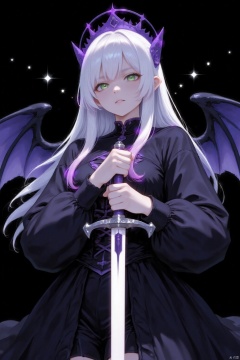 An animated image of a woman with long white hair and green eyes. She is holding a sword in her right hand. Her left hand is positioned in the middle of the image. Her right hand is holding the sword in the left hand. The woman is wearing a black dress with a purple crown on her head. Her wings are spread out around her shoulders. Her dress is black with purple accents. There are white stars on the black background.