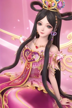 masterpiece, best quality, masterpiece,best quality,official art,extremely detailed CG unity 8k wallpaper,1girl,solo,long hair,looking at viewer,black hair,very long hair,crown,pink dress,hair rings,necklace,bare shoulders,jewelry,happy,happy,sitting,