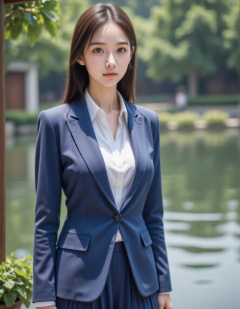 HDR photo of 1girl,solo,realistic,real people,shiny skin,blue clothes,pale skin,suit,skirt,full body,outdoors, <lora:20250110_Again_Girl_F.1_6:1>