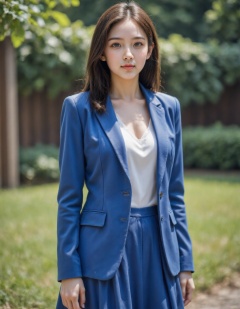 HDR photo of 1girl,solo,realistic,real people,shiny skin,blue clothes,pale skin,suit,skirt,full body,outdoors, <lora:20250110_Again_Girl_F.1_6:1>