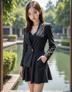 HDR photo of 1girl,solo,realistic,real people,shiny skin,pale skin,suit,skirt,full body,outdoors, <lora:20250110_Again_Girl_F.1_6:1>