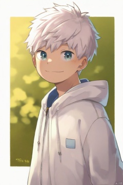 steelwire-style,1boy,white hair,white jacket,border,child,drawstring,hood,hood down,hooded jacket,jacket,male focus,outside border,short hair,smile,solo,upper body,white border (masterpiece,best quality),