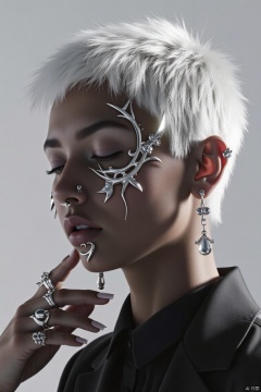 1girl, solo, short hair, simple background, jewelry, white hair, earrings, dark skin, grey background, dark-skinned female, lips, piercing, ring, ear piercing, portrait