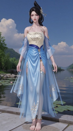 1girl,solo,looking at viewer,juru2,breasts,huge breasts,huge buttocks,realistic,long hair,black hair,hair rings,hair bun,hair ornament,chinese clothes,bare shoulders,necklace,topknot,dress,blue dress,see-through,see-through sleeves,skirt,long skirt,thighhighs,jewelry,makeup,red lips,barefoot,anklet,huolinger,YMJHyiqingqiu,HANFU DRESS.,sky,blue sky,water,lily,