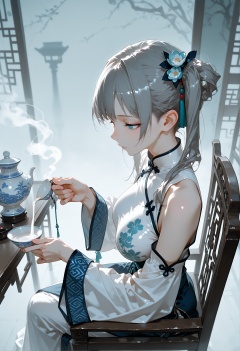 masterpiece,best quality,good quality,very awa,very aesthetic,absurdres,newest,(dino_(dinoartforame):0.5),(yoneyama mai:0.5),1girl,grey hair,Side ponytail,large breasts,cyan_eyes,chinese clothing,long_sleeves,wide cuffs,shoulders,exquisite scene,antiqq,blue and white porcelain,girl sitting in a quaint chair,carved rosewood furniture,exquisite face,longeyelashes,face focus,plum_blossom,fog,strong color contrast,censer,from side,from above,holding,take the teacup,