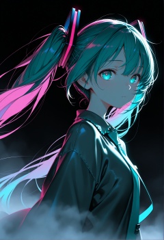 Hatsune Miku,limited palette,black background,colorful,vibrant,glowing outline,neon,blacklight,looking at viewer,fog,from_side,masterpiece,best quality,amazing quality,very aesthetic,absurdres,newest,impactful picture,offcial art,movie perspective,three quarter view,dutch angle,(choco (chocolate shop):0.5),(Yomu:0.5),(chiaroscuro:0.5),(WANKE:0.5),(yunsang:0.5),(ningen mame:0.5),(ke-ta:0.5),(yoneyama mai:0.5),