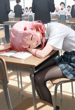 masterpiece,best quality,amazing quality,very aesthetic,absurdres,newest,Yuzuriha Inori,1girl,classroom,lying on the table,head tilted,school uniform,plaid skirt,black_pantyhose,sit on a chair,face on the table,eyes closed,saliva flowing on the table,crowds,laughing,