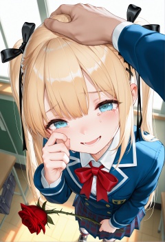 masterpiece,best quality,amazing quality,very aesthetic,absurdres,newest,(otokoe:0.5),(bodhi wushushenghua:0.5),(torino:0.5),1girl,marie rose,holding the rose,tears of joy,one hand wiping tears,from_above,happy,school_uniform,class_room,boy touches girl's head,