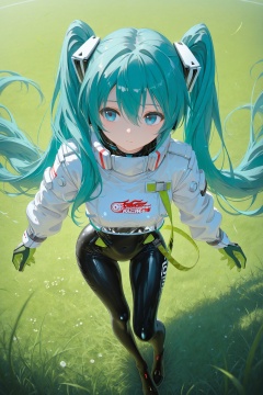 masterpiece,best quality,amazing quality,very aesthetic,absurdres,newest,impactful picture,offcial art,movie perspective,(void 0:0.5,(torino aqua:0.5), (umehara sei:0.5), 1girl,solo,s1_dram,from above,on grass,RHM22,hatsune miku,1girl,racing miku,solo,green gloves,twintails,long hair,blue eyes,black bodysuit,two-tone gloves,aqua hair,hair between eyes,jacket,long sleeves,white jacket,long legs,,