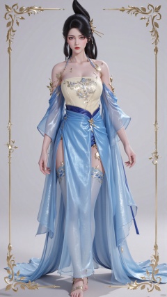 1girl,solo,looking at viewer,juru2,breasts,huge breasts,huge buttocks,realistic,long hair,black hair,hair rings,hair bun,hair ornament,chinese clothes,bare shoulders,necklace,topknot,dress,blue dress,see-through,see-through sleeves,skirt,long skirt,thighhighs,jewelry,makeup,red lips,barefoot,anklet,huolinger,YMJHyiqingqiu,HANFU DRESS.