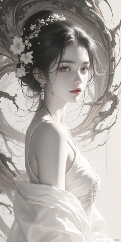 Digital art,a woman in a white dress standing in front of a black and white painting. Her face is clearly visible,with her eyes looking off into the distance. Her hair is long and wavy,and her dress is flowing around her. The painting is intricate and detailed,with a variety of shapes and colors.,