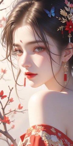 Stylized Portrait of a Woman with Red Lipstick and Butterfly Earrings,Surrounded by Floral Elements., masterpiece:1.2),best quality,high resolution,unity 8k wallpaper,(illustration:1),perfect lighting,extremely detailed CG,finely detail,extremely detailed,soft lighting and shadow,soft yet striking lighting,film grain:1.2,(skin pores:1.2),(detailed skin texture:1),((solo:1.5)),Detailed face,(see-through:1.1),misty,Low Key:1.1,depth of field,