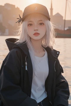 medium shot, medium shot, depth of field, bust, upper body, cinematic angle, masterpiece, Best quality, super detailed, computer graphics, 8k wallpaper, Beautiful face, tender eyes, countries, One, white long hair, yellow eyes, hairpin, White shirt, black jacket with a hood, black baseball cap, black stockings, black boots above the knee, sunset, medieval port, harbour, Detailed water surface, Reflection of the Sun, masterpiece, detailing, full height, detailing, Maximum Drawing