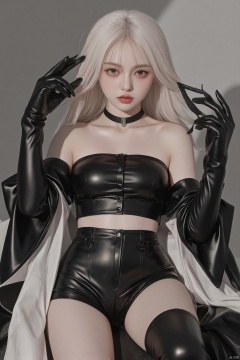 masterpiece, best quality, ultra-high-detailed, Disgusted face, white hair, red eyes, sigtuna julie , small breast, looking viewer like a trash , deep eyes , down shot, (((black latex shorts))), (((black latex thigh high boots))), black latex top, bare midriff, (bare thighs), (black latex gloves), leather choker, dominatrix, goddess, femdom, mistress, no use skirt, Warm body, hot body, A lot sweat , more sweat, hot temperature, sweating, Sweated a lot, warm room, bare shoulder, showing shoulder, Collarbone, Human, goth, emo, piercings, skinny, sexy, short, leather, crop top, shorts, , black corset, latex pants, bare shoulder, Collarbone, Tight thights , no skirt, sitting, black latex, Below shot, Fit girl, muscle girl, fit body, showing feet