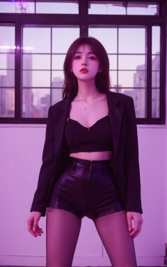 Pantyhose\(hubg Style)\,a young Asian woman, dressed in a black blazer, a black skirt, and black tights, is striking a pose in front of a large window. The woman's hair is long, straight, and her eyes are a piercing red. She is wearing a silver necklace, adding a pop of color to her outfit. The backdrop is a stark white wall, and the window is filled with windows, creating a striking contrast to the woman's outfit.