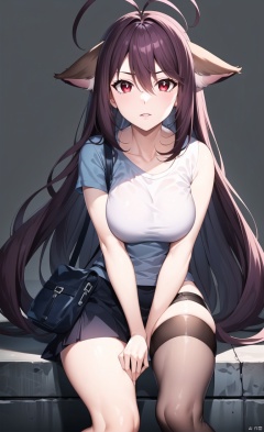 Urban background, T-shirt top, short sleeved T-shirt, short skirt, skirt, black stockings, black stockings, shoulder bag,
