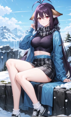 Blue sweater, furry clothes, furry top, purple scarf, medium length skirt, plaid skirt, jumpsuit, jumpsuit socks, black jumpsuit socks, sports shoes, shoes, on the mountaintop, overlooking the mountain below, sitting on the mountaintop, snow, snow background,