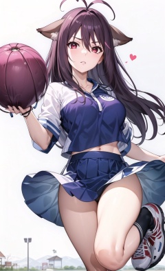 Cheerleader uniform, red bow tied around the neck, white shirt short sleeved, purple short leather jacket, purple checkered medium skirt, checkered skirt, white socks, knee high socks, sports shoes, holding purple flower balls in both hands, dancing, jumping, on the playground,