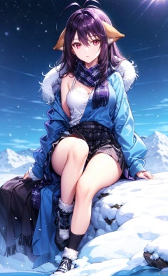 Blue sweater, furry clothes, furry top, purple scarf, medium length skirt, plaid skirt, jumpsuit, jumpsuit socks, black jumpsuit socks, sports shoes, shoes, on the mountaintop, overlooking the mountain below, sitting on the mountaintop, snow, snow background,