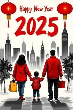 Charcoal_style,A charcoal graffiti illustration celebrating the New Year. Above it is written in large red characters "Happy New Year 2025". There are three characters in the picture, all wearing red jackets, exuding a festive atmosphere. The woman on the left is holding a yellow bag, the child in the middle is carrying a backpack and holding a red gift box, and the man on the right is also holding a red gift box. The background is several high-rise buildings outlined by charcoal graffiti, presenting a cityscape. There are red lanterns in the upper left and upper right corners of the picture, further enhancing the atmosphere of the New Year. The overall picture is filled with a sense of celebration and warmth.,huaijiu