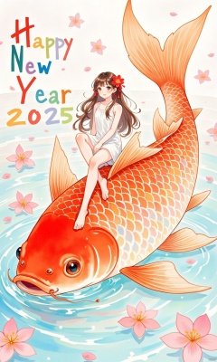 qfjl,Chinese style illustration,An animated image of a girl with long brown hair, wearing a white dress and a red flower in her hair. The girl is sitting on top of a large orange fish that is floating on a body of water. The fish has a long orange tail that extends from the top of the fish to the bottom of the image. There are pink flowers floating in the water around the fish.surrounded by the colorful text " Happy New Year 2025 “,watercolor