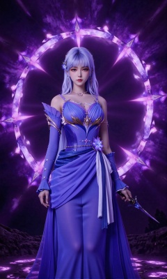 The woman is wearing a long, flowing blue dress with a high neckline and long sleeves