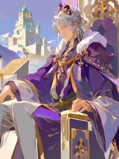 GYCH, a noble, regal figure, with silvery gray hair and deep amethyst eyes, dressed in a royal purple and gold robe adorned with jewels. The figure sits upon a throne, with a backdrop of grand castles and towering mountains.