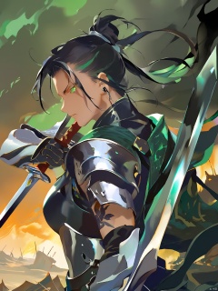 GYCH, a fierce, warrior-like figure, with jet black hair tied back and piercing emerald eyes, clad in armor of polished steel and dark green. The figure stands with sword drawn, facing an army of shadowy foes, with a backdrop of battle-scarred landscapes.