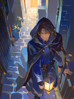 GYCH, Mysterious and hooded, with shadows obscuring dark hair and deep set, cobalt eyes, he dons a black and silver cloak. The figure steps forward, revealing a cobblestone alleyway lined with flickering torchlight.