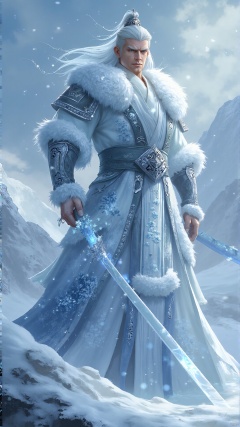 Chinese style, Frost and Snow Swordsman On the snow-covered mountain top, his face is square, resolute and tough. Dressed in a thick white robe, embroidered with ice flowers, as if integrated with the snow scene. Holding a long sword with a cold glow, engraved with ancient runes, and surrounded by snowflakes, he looked like a warrior in the snow, cold and bold