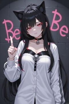 An animated image of a woman in a black bra with a silver bell around her neck. The woman has long black hair that is styled in a cat-like fashion. Her eyes are a piercing red, and her hair is a light gray color. She is wearing a long sleeve white shirt with black stripes on the sleeves. Her hair is pulled back in a ponytail with a black bow at the top of her head. Her left hand is raised up in the air. The backdrop is a dark gray wall with pink graffiti on it. The word "Be" is visible on the wall.