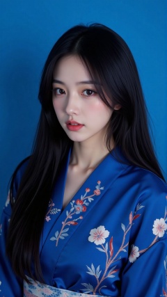Close-up of an Asian woman with long black hair. Dressed in a blue kimono, decorated with intricate designs. The woman's face is adorned with bright red eyes, adding a pop of color to the scene. The background is a vibrant blue that contrasts nicely with the women's attire. The outfit is embellished with intricate patterns adding synthetic depth.