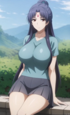 Big breasts, big breasts, Big breasts, big breasts, hands on hips,Sitting on the stairs, legs bent,