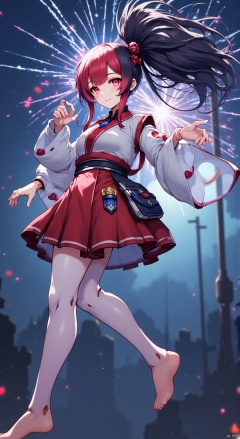 1girl, solo, long hair, looking at viewer, smile, bangs, black hair, ribbon, holding, bare shoulders, twintails, standing, red hair, multicolored hair, japanese clothes, shoes, barefoot, looking back, wide sleeves, pink eyes, kimono, from behind, feet, red ribbon, mask, toes, night, soles, standing on one leg, mask on head, fox mask, shoes removed, fireworks, holding shoes