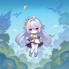 rosmontis \(arknights\),1girl,Loli Character - Petite and Solo Female,hair between eyes, Silver Hair with Asymmetrical Style, very long hair, grey hair, bare_shoulders, Red Eyes with Slit Pupils, blue_sky, braid, blurry foreground, closed_mouth, cloud, confetti, day, solo, blurry, outdoors, looking_at_viewer, bird, clock_tower, White Thigh-Highs with Thigh Straps - Sleeveless White Dress with Lace Trim - Piercing Red Eyes with Slit Pupils - Strapped Dress with a Wariza-Inspired Style - Asymmetrical Legwear for Visual Contrast - Mystical Forest with Rich Flora and Fauna - High-Resolution Fantasy Artwork - Masterpiece Quality with Intricate Details - Clean Imagery Free of Text or Watermarks