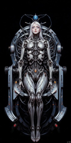 DJXG, in the foreground of the screen, there is a silver female robot sitting on a mechanical seat with her legs crossed.This mechanical seat is highly distinctive, with its overall frame made of high-strength metal. The metal surface has a delicate frosted texture, and under the illumination of light, it emits a faint cold light. The main body of the seat is embedded with a huge reinforced glass, which has extremely high transparency and allows for a clear view of the complex mechanical structure inside the seat from above.The mechanical structure beneath the glass resembles a precision small factory. Various uniquely shaped metal gears interlock with each other, and the large gear drives the small gear to operate in an orderly manner. The edges of the gears have exquisite serrated textures, and each serrated tooth seems to have been carefully polished. The metal rods crisscross, connecting different gears and mechanical components. These metal rods are engraved with fine scales and markings, as if expressing their importance. In the depths of the mechanical structure, there are some tiny pistons that move up and down in a regular manner, emitting a slight "hissing" sound, like the breathing of the entire machine. The armrest of the seat is also composed of metal and glass, and the outer side of the metal armrest has a streamlined design that conforms to ergonomics, providing excellent grip. The inside of the armrest is transparent glass, with blue energy light flashing and flowing inside, like an electric current shuttling through it, providing some mysterious energy support for the entire seat.Her left half showed humanoid physical features. The skin is delicate and smooth, with clear and distinguishable textures and a soft luster. The tiny pores are clearly visible, as delicate as real human skin. The expression on the left side of the face is vivid, the eyes are lively and sparkling, like stars, the eyebrows are naturally curved, the lips are a healthy flesh pink, the hair is soft and hanging on the shoulders, and the strands of hair are full of vitality, swaying slightly when the body is still. The muscle lines of this half of the body are smooth, and even when still, it seems to contain flexibility and vitality that can erupt at any time.Its right half is a futuristic mechanical structure. The cold and hard metal shell covers this half of the body, with a smooth and shiny surface, and the metal plates are tightly stitched together, just like carefully crafted mechanical armor. Mechanical joints are composed of various shapes of small gears, screws, metal rods, etc., with precise and complex structures. The mechanical textures at the joints seem to provide insight into the precise operation inside during movement. The internal circuit pipelines are interwoven and crisscrossed, with light blue light flowing through them, like blood in a mechanical body, providing energy to the right half of the body. The mechanical skeleton is like a sturdy frame of a building, strongly supporting the right half of the body. The right half of the eye is an electronic eye emitting cold light, which is like a blue flame, mysterious and highly technological.She was dressed in exquisite Hanfu, which fitted perfectly to her body, showcasing classical beauty everywhere.Behind her is a pure black background with a highly eye-catching brain computer interface device. This device has a metallic shell with complex patterns and flashing indicator lights. It is connected to the robot's head by many small wires, which resemble silver threads and stand out against a black background. These lines are like bridges for information transmission, connecting the robot's brain with unknown sources of information, implying that she may have super strong data processing abilities or the ability to interact with external consciousness, which makes her appear even more mysterious and unpredictable.The entire image was captured using high-definition photography techniques, with the photographer employing symmetrical composition centered around a female robot to create a symmetrical distribution of foreground and background. The image is balanced and stable, allowing viewers to fully experience the details and unique atmosphere of the picture from all angles.,W4RR10R,MECHANICAL TRANSFORMATION,,MECHANICAL PARTS,