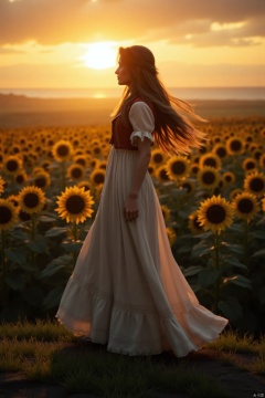 OBbllai, A captivating outdoor photograph of a model with long, flowing hair, wearing a flowing gown, standing on a hilltop overlooking a vast field of sunflowers at sunset. The warm golden light of the setting sun bathes the scene in a magical glow. High resolution, 8k, sunset lighting, hyperrealistic, photorealistic, detailed textures, shallow depth of field, lifestyle photography, advertisement photography, romantic sunset, flowing dress, trending on artstation.,Aerith Gainsborough,