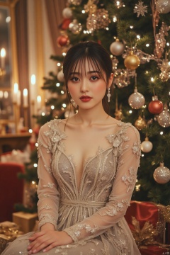 A glamorous image of a woman with flawless makeup and elegantly styled hair, wearing a shimmering, sequined Christmas dress, posing gracefully in front of a lavishly decorated Christmas tree. The setting is opulent and luxurious, with sparkling ornaments, expensive gifts, and a feeling of festive extravagance. The overall mood is glamorous and festive, emphasizing the luxurious aspects of Christmas celebrations. High resolution, 8k, soft lighting, hyperrealistic, photorealistic, detailed textures, shallow depth of field, glamorous Christmas, luxurious setting, festive atmosphere, trending on artstation.,HARUKA