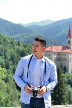 jzns,wjc,solo,realistic, The man is wearing a blue and white striped shirt and a white T-shirt inside. He is holding a camera and standing in a beautiful outdoor scene with lush mountains and ancient buildings in the background. He is smiling and looking to the side, giving an overall impression of a relaxed and enjoyable life.