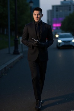 1man,(realistic:1.3),Combat posture,male focus,asian,exquisite facial features,handsome,muscular,suit,shirt,pants,footwear,full body,dimly lit,city,outdoors,neon lights,Dynamic pose, Lichen background, Russian landscape, romantic realism, atmospheric, perfect background, magnificent, masterpiece, realistic, best quality, highly detailed,profession, creative, glowing, dynamic,jzns,wjc