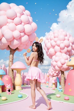 Create an enchanting fantasy landscape featuring a cheerful young asian woman in a pink bikini and a frilly skirt, playfully standing with her back to the viewer while holding a colorful swirl lollipop. She has long, wavy hair adorned with a headband that has cute, cookie-shaped bunny ears. The background is filled with oversized, fluffy pink cotton candy trees, vibrant candy mountains, and whimsical mushroom-shaped structures. Scattered throughout the scene are cheerful pastel-colored candies and playful cartoon character figurines, all under a bright blue sky dotted with fluffy clouds and colorful confetti-like elements falling gently. The overall atmosphere is sweet, playful, and vibrant, evoking a sense of fun and fantasy.
