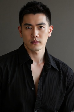 jzns,wjc,solo,realistic, The man in the picture is wearing a black pleated shirt with the collar slightly open, revealing part of his chest. an indoor environment with soft lighting, which highlights the man's deep eyes and three-dimensional features, giving an overall impression of being handsome and charming., masterpiece, realistic, best quality, highly detailed,