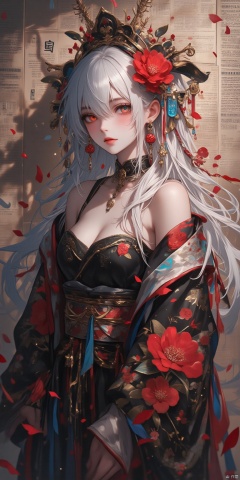 A young Asian woman wearing a flower wreath,An Acrylic style painting that is expressive, gives it a dynamic and emotional quality.a woman with a ethereal red and blue mist surrounding her body. The mist creates a dramatic and surreal effect. A red flower, that is blooming, covering one eye, attached to the face. The woman has a cold aesthetic, complimented by her white hair. Anime art of woman draped in shadows with a lighting that enhances her sexy unique features. with a black kimono adorned with flowers. The background is blurred The background is a wall with Chinese characters written on it creating a stark contrast to the woman's outfit. filled with red rose petals.