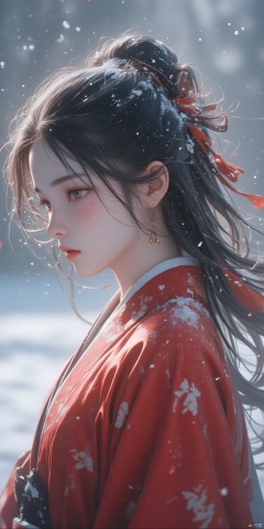 cinematic photo ,Best quality , (masterpiece:1.2) , cinematic photo,1girl,A beautiful girl in red hanfu, Standing in the wind andsnow, long hair blown by the wind,snow in the sky , upperbody,snowing,snowy day,in winter ,motion blur ,(sad:1.1),(crying:1.1),close-up,(tears:1.1),(face focus:1.1),(close mouth:1.1),front view ,35mm photograph, film, bokeh, professional, 4k, highly detailed,helgirls