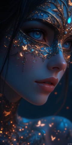Close-up of a woman's face, focusing on her right side, wearing an ornate, intricate masquerade mask that covers her eyes and upper nose. The mask is detailed with lace-like patterns, embedded with small glowing lights and tiny luminescent butterflies, primarily in blue and orange hues. The mask has an elaborate design that merges seamlessly with her skin, which is illuminated with bioluminescent patterns glowing in shades of blue and orange, covering her neck, shoulders, and chest. Her lips are slightly parted, showing a natural yet,1girl