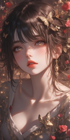 Stylized Portrait of a Woman with Red Lipstick and Butterfly Earrings,Surrounded by Floral Elements., masterpiece:1.2),best quality,high resolution,unity 8k wallpaper,(illustration:1),perfect lighting,extremely detailed CG,finely detail,extremely detailed,soft lighting and shadow,soft yet striking lighting,film grain:1.2,(skin pores:1.2),(detailed skin texture:1),((solo:1.5)),Detailed face,(see-through:1.1),misty,Low Key:1.1,depth of field,