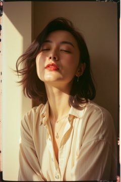 A woman,old polaroid picture,awj,polaroid portrait photography,xuanwo,dtmh,neomj,The image depicts a young woman bathed in warm,natural light that casts a dynamic shadow on the wall beside her. Her expression is serene,with her eyes closed and head tilted slightly upwards,as if soaking in the sun's rays. The woman's hair is tousled and flows around her face and shoulders,suggesting a sense of movement or a gentle breeze in the room. She wears a loose,unbuttoned white shirt that contributes to the relaxed and informal feeling of the portrait. The soft lighting highlights her facial features and creates a contrast with the shadowed portions,which adds depth and a sculptural quality to the image. The overall effect is one of peaceful contemplation or a moment captured in solitude.,