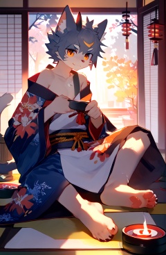 1boy,furry,male,bare foot,cat boy,kimono,