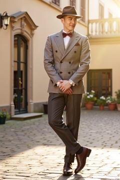 He is wearing a dark brown felt hat on his head. The hat top is slightly concave, and the brim is gracefully curled up on one side, revealing his smooth and full forehead and neatly trimmed sideburns. On his upper body is a thick-textured British plaid suit jacket. The classic houndstooth pattern weaves a retro charm. Paired with a waistcoat of the same color series, the double-breasted design is exquisite and retro. Inside is a off-white shirt, with a burgundy silk tie, and the bow tie is tied perfectly, showing elegance. His lower body is clad in a pair of dark grey woolen straight-leg trousers, with distinct creases. He is wearing a pair of polished brown leather shoes, and every step he takes shows the calmness of a gentleman.