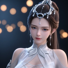 (upper_body:1.1),(huge breasts:0.9),78.<lora:YQponyguxiaosangV2:0.8>,(q1528437228:1.3),1girl,solo,dress,long_hair,white_dress,hair_ornament,jewelry,earrings,black_hair,clothing_cutout,brown_hair,blue_eyes,tiara,ponytail,shoulder_cutout,bare_shoulders,hair_bun,boots,see-through,cape,facial_mark,,blush,(looking_at_viewer:1.1),BREAKintricate details,shiny_skin,solo focus,(blurry background:1.1),(depth of field:1.1),perfect_anatomy,(cinematic lighting:0.9),(volumetric lighting:0.9),(simple background,pure black background,black background:1.1),